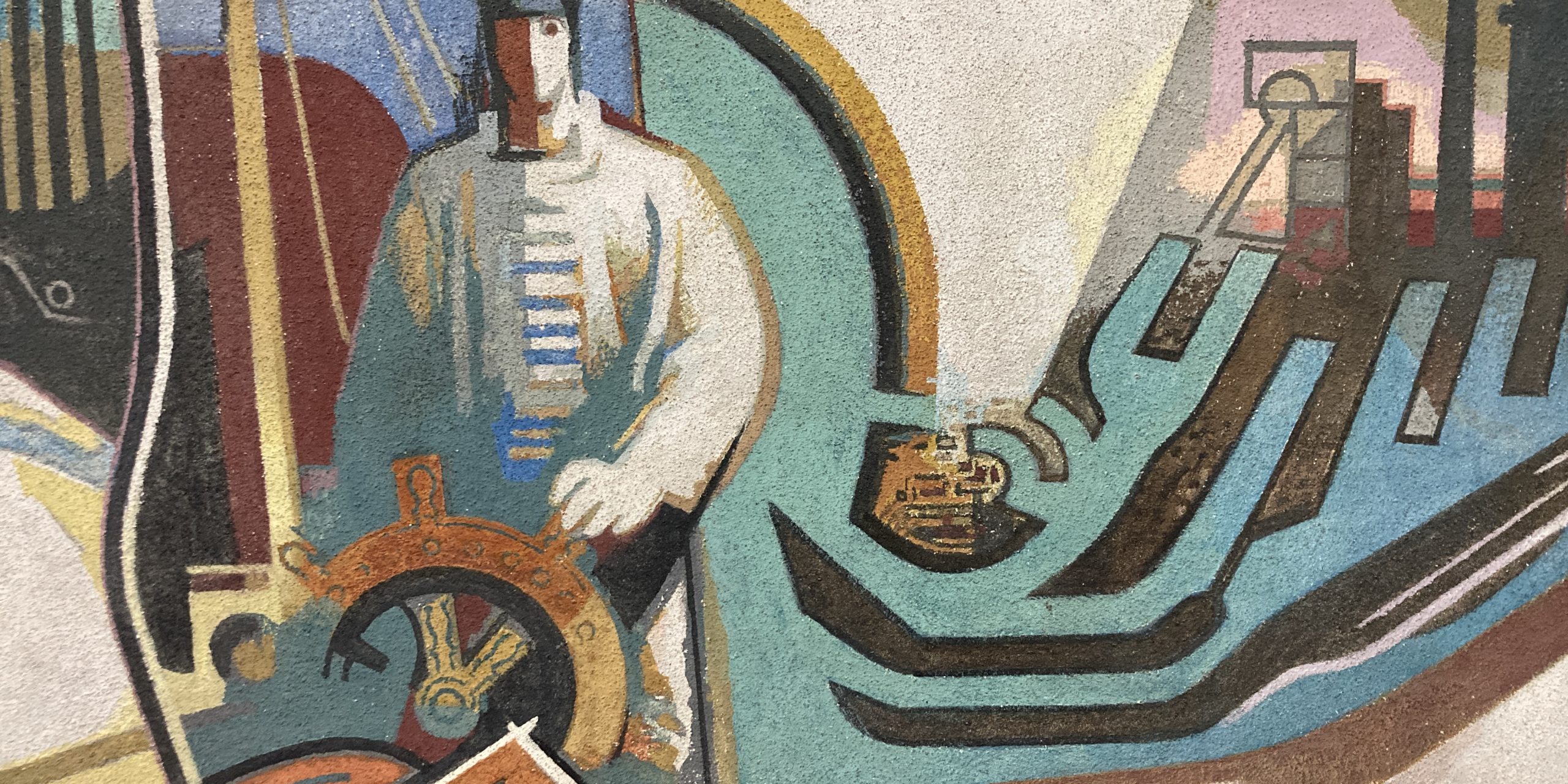 Magazine bergen oft unbekannte Schätze. Im Kultur- und Stadthistorischen Museum schlummert ein Gemälde, hinter dem sich eine spannende Geschichte unserer Stadt verbirgt. Es zeigt einenBinnenschiffer am Steuerrad vor stilisierten Hafen- und Industrieanlagen und wurde 1950 von dem Künstler Otto H. Gerster gemalt. Ihn kennen nur wenige Duisburger, aber das Bild weckt bei vielen Erinnerungen. Schließlich zierte es von 1950 bis 1962, also mitten im Wirtschaftswunder, als großes Wandgemälde die hohe Halle des Duisburger Hauptbahnhofs. Hunderttausenden von Bahnreisenden präsentierte das 10 mal 18 Meter große Monumentalgemälde die geballte Wirtschaftskraft mit Binnenhafen, Kohle- und Stahlumschlag. Auf alten Fotos ist das Wandbild meist nur in Schwarz-Weiß zu sehen. Umso überraschender ist es, dass das kleinformatige Gemälde aus dem Magazin die Farbgebung des Künstlers Otto H. Gerster in beeindruckender Qualität zeigt. Für das Stadtmuseum handelt es sich um ein besonders erhaltenswertes Gemälde, wie die Kunsthistorikerin Kai Ricarda Reinhoff, wissenschaftliche Volontärin am Stadtmuseum, erläutert: „Entwürfe für monumentale Wandmalereiarbeiten sind erstmal nichts Außergewöhnliches. Was aber den Entwurf des Wandgemäldes von Otto H. Gerster in unserer Sammlung so wertvoll macht, ist, dass es eine authentischere Zugänglichkeit durch seine Farbigkeit und Technik zum Original ermöglicht als es die wenigen erhaltenen schwarz-weiß-Fotografien hergeben. Der Entwurf gibt einem die Chance, sich das verborgene Wandgemälde in einem kleinerem Format anschauen zu können.“