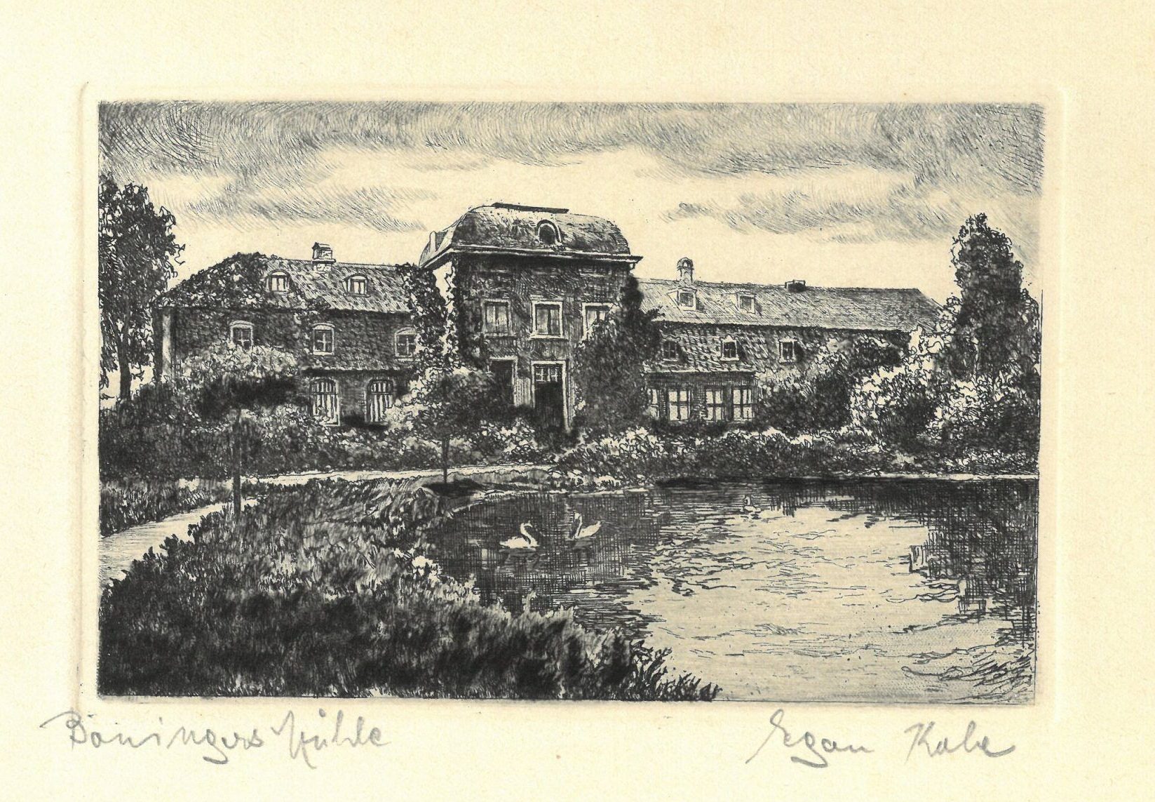 Eine kürzlich dem Stadtmuseum geschenkte Radierung aus dem Bestand des Rheinischen Mühlen-Dokumentationszentrums (RMDZ) erinnert an die Böningermühle in den 1920er-Jahren. Die Radierung stammt von dem Künstler Egon Kobe. Sie zeigt die Sommerresidenz der Familie Böninger. Vor dem Hintergrund dichten Grüns mit Teich, Schwänen und üppigem Uferbewuchs fängt er in feiner Schraffur die idyllische Ruhe dieses Ortes ein – ein typisches Motiv der Heimatgrafik der Zwischenkriegszeit. Kobes präzise Linien und romantische Überhöhung machen das Blatt zu einem Schatz lokaler Erinnerungskultur. Dr. Marius Lange, wissenschaftlicher Mitarbeiter des Stadtarchivs, hat die Geschichte hinter dem Bild recherchiert.